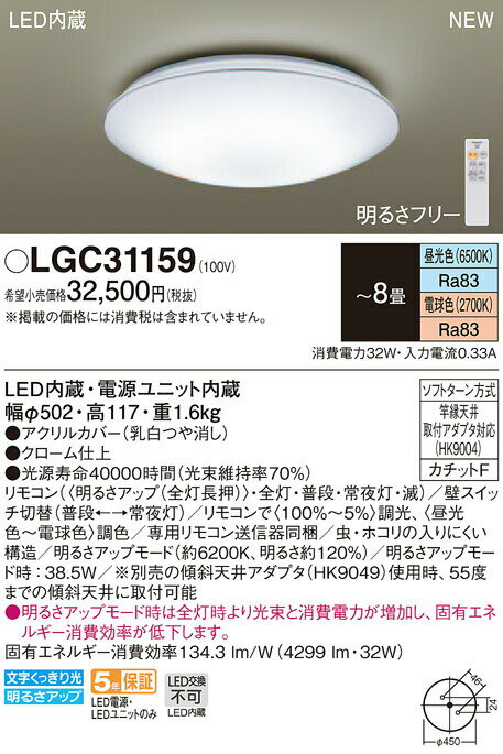 照明 おしゃれ ライトパナソニック Panasonic シーリングライトLGC31159 調光・調色昼光色〜電球色アクリルカバー乳白つや消し 〜8畳